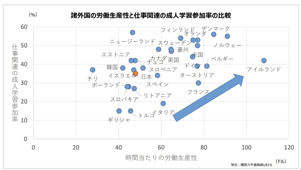 なお、文部科学省の資料「リカレント教育の推進に関する文部科学省の取組について」では、成人学習の参加率が高い国ほど労働生産性が高い傾向にあるという調査結果を報告している。