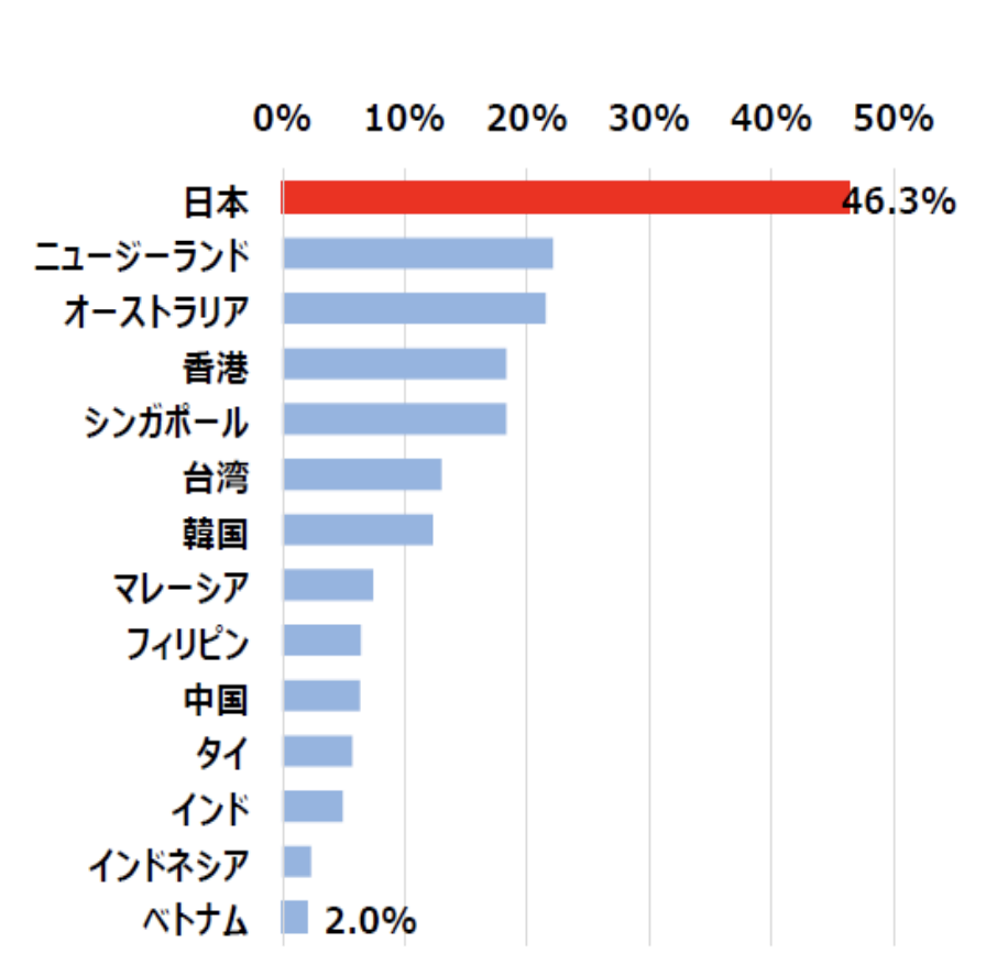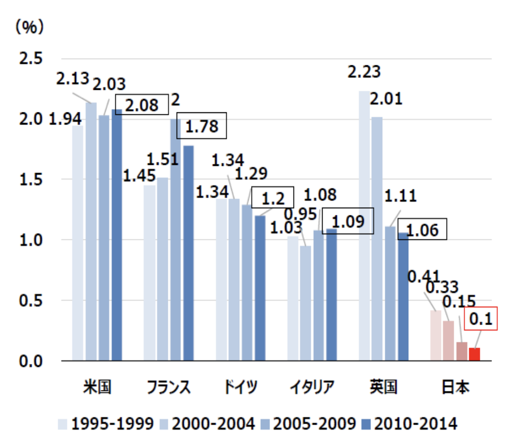 日本は世界各国と比較して数値が低い上、「1995年-1999年」の0.41%から「2010年-2014年」は0.1%となっており低下傾向にあることもわかる。