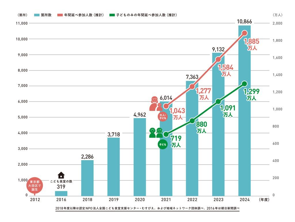 2024年の年間延べ利用者数は1,885万人で、前年より約300万人の増加となった。このうち子どもの利用者は1,299万人で約200万人の増加となっており、こども食堂がなくてはならない存在となっていることもうかがえる。