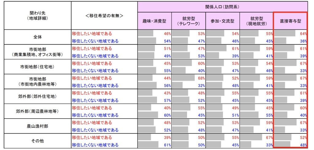 また以下の表では、関わり先の地域別で移住希望の有無を表している。
