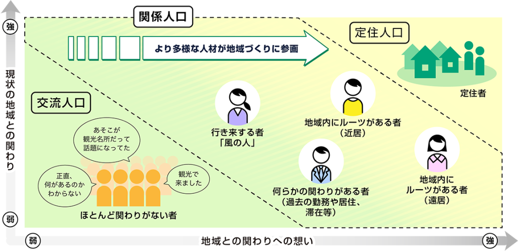 これらに対して、関係人口は何らかの理由で複数回あるいは継続的に訪れている人々を指す。観光で一度訪れた人は交流人口だが、リピーターとして何度も訪れている人は関係人口に区分される。つまり、地域との関係性によって、交流人口と関係人口に分かれる。