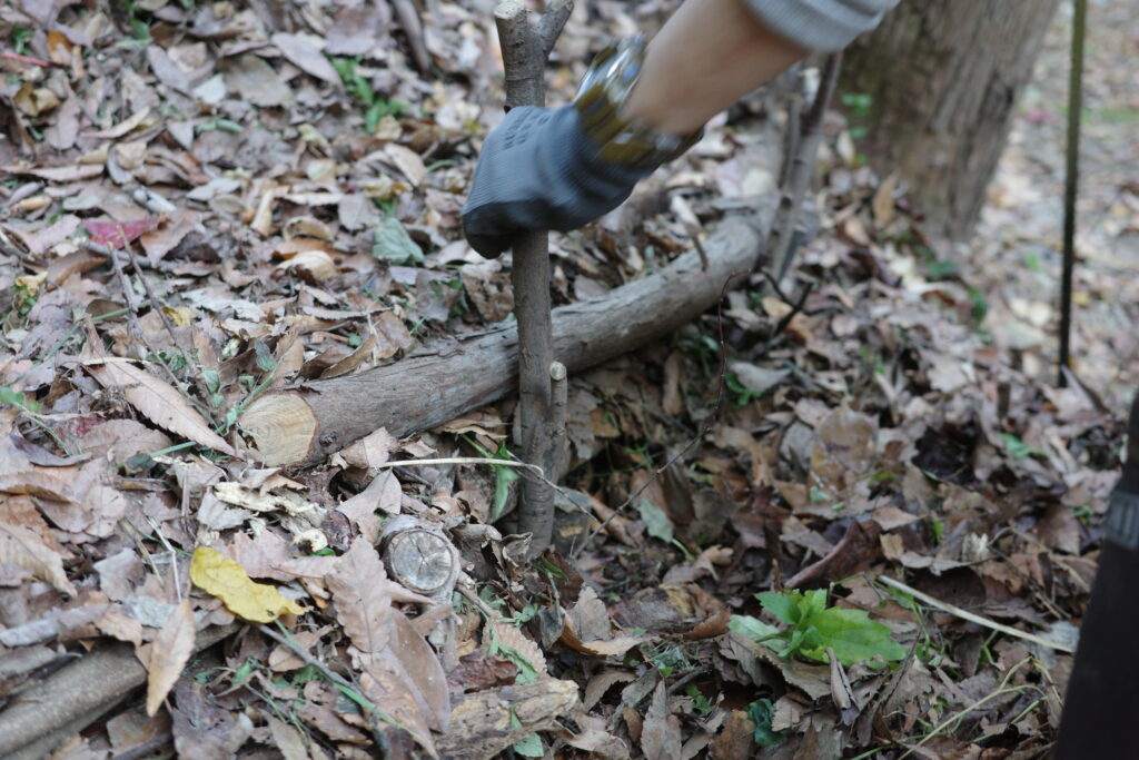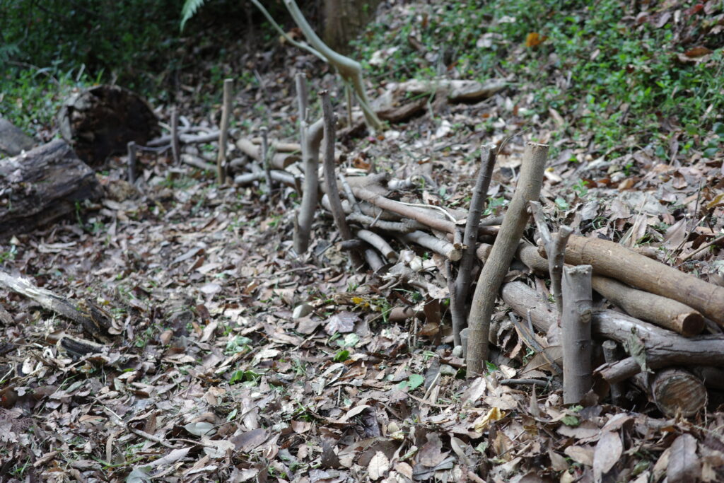 続いて斜面と平地の境目に掘った溝に枝や落ち葉を入れて、太い枝や細い枝を交差するように組み合わせて柵を作っていく。
