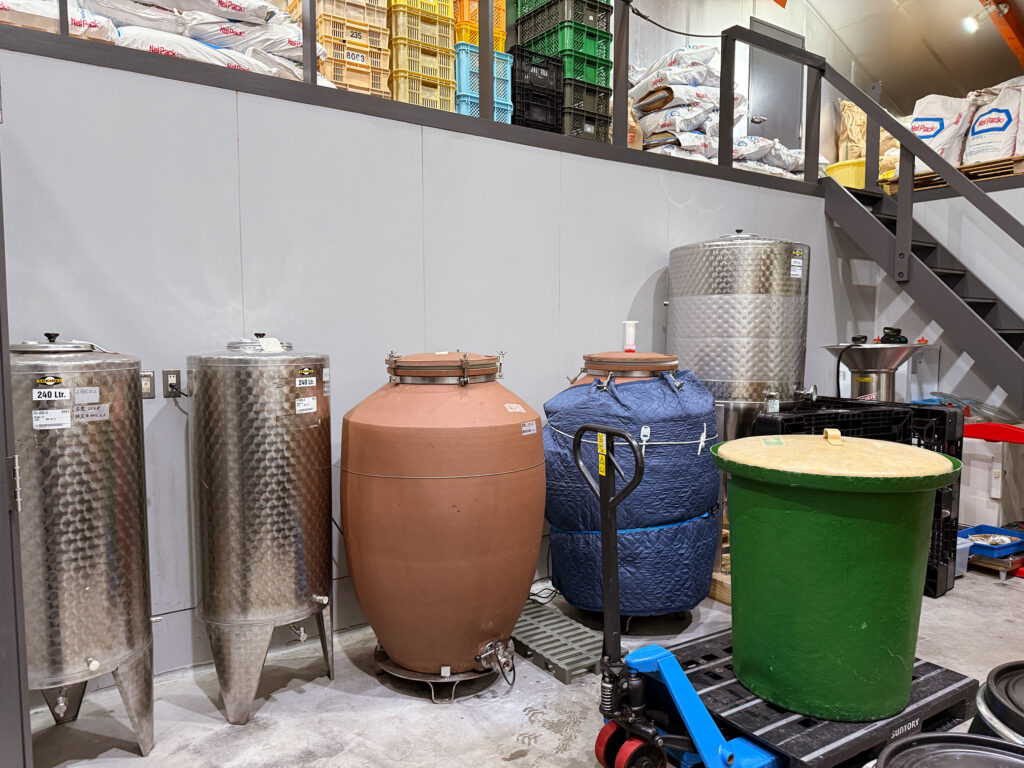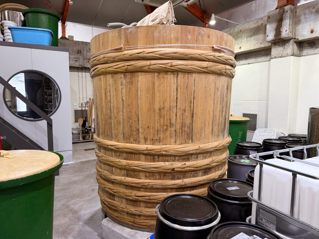 テラコッタの瓶や金属製タンクなどが並んでいるが、中でもひときわ存在感があるのが、巨大な杉樽だ。醤油や味噌の醸造に使われるものだそうで、吉野杉を真竹で編んだ木桶である。杉のいい香りがつくため、果物の発酵槽として使っているとのことだ。