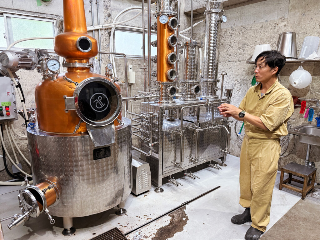 2つ目は、蒸留機の部屋だ。まるで金管楽器のような美しいフォルムの蒸留機は、装飾が施されているわけではないのに格好がいい。この機械で発酵液を熱して蒸気にして、冷却し、原料の成分が凝縮されたアルコール度数の高い液体にする。なんと、蒸留機は1か月かけて江口さんが自分で組み立てたのだそうだ。