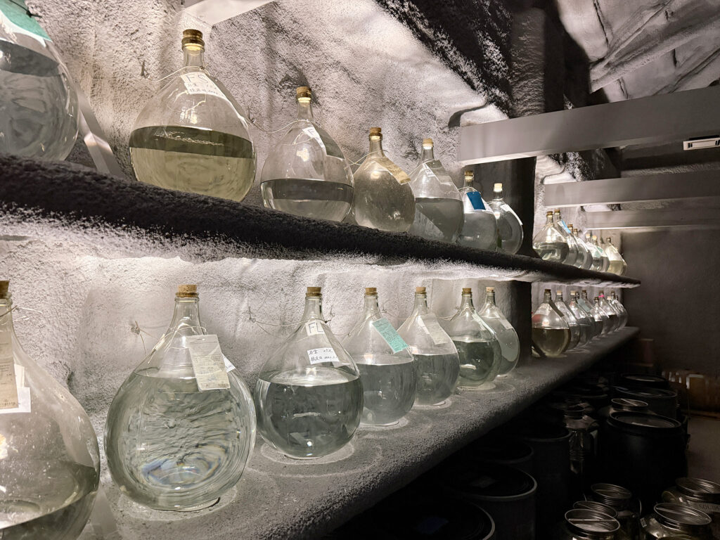 3つ目は、熟成の部屋、すなわちセラーである。蒸留後の液体が、フラスコ型のガラス容器と、オークの樽に入れられて、静かに寝かせられている。半年から一年経つと、まろやかな味になり製品化される。ちなみにヘッドは落ち葉に浸けてポプリにしたり、テールは数種類を混ぜて再蒸留したりというように使われている。
