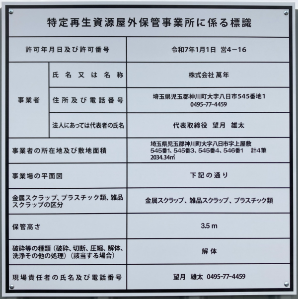 株式会社萬年は、2025年1月1日に施行された「埼玉県特定再生資源屋外保管業の規制に関する条例(令和6年埼玉県条例第64号)」第8条第1項の規定に基づき、特定再生資源屋外保管業の許可を取得いたしました(許可番号:営4-16)。