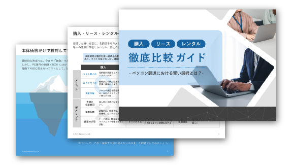 知っているようで意外と知らない、購⼊‧リース‧レンタルの違いを徹底⽐較。 表⾯的な価格差だけでは⾒えてこなかった、PC運⽤におけるトータルコストの 実態を明らかにします。費⽤‧⼿間‧リスクすべての観点で損をしたくない担当 者様必⾒のお役⽴ち資料です。